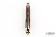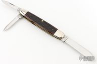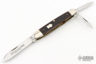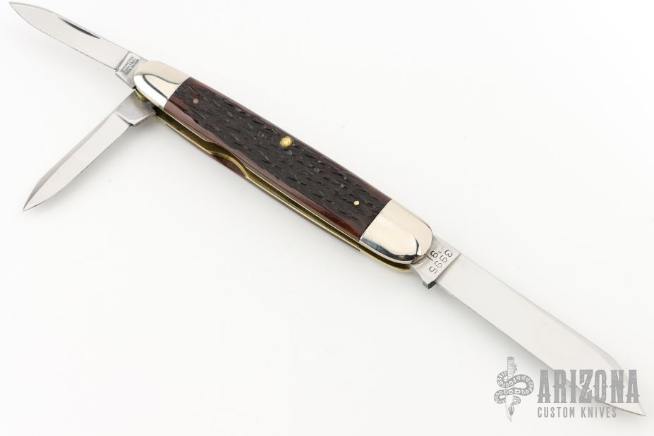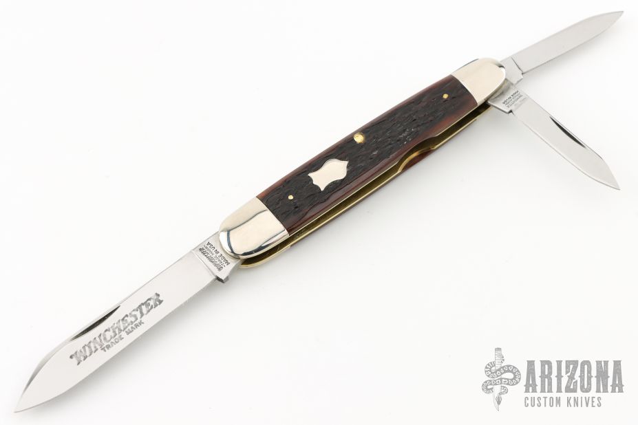 This Winchester folder features three mirror polished blades. Nickel Silver front and rear bolsters with jigged bone covers. Brass liners and steel springs. Original box. Excellent condition.