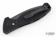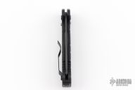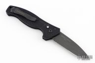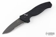 This Gerber Emerson Alliance tactical knife has a black finished 154-CM stainless steel partially serrated drop point blade. Handle is black anodized aluminum with milled scales and notched thumb rest, safety button, lanyard hole, and black stainless steel tip up clip. Excellent condition. This was the first auto that Gerber ever made. Comes with origianl box and papers.