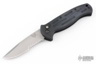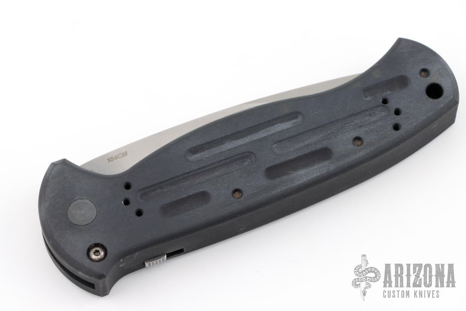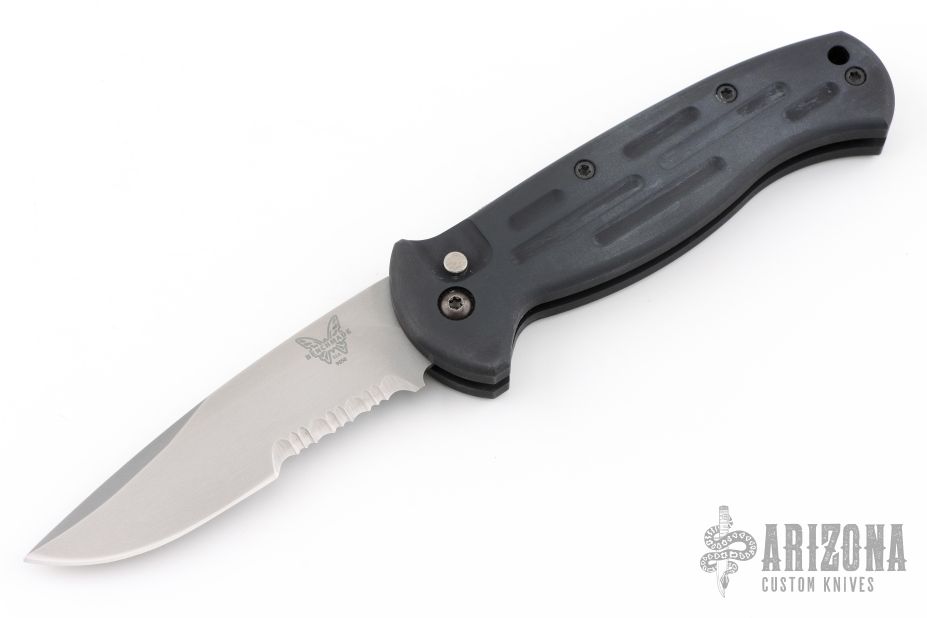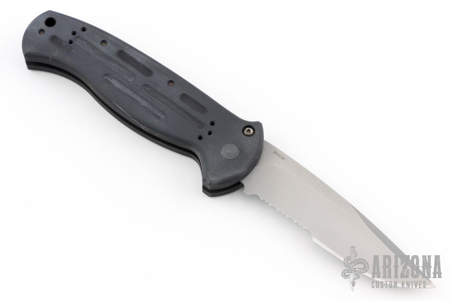This AFT by Benchmade features a bead blasted partially serrated blade. The handle has a black aluminum frame. Includes the original box and papers. Excellent condition. NO CLIP