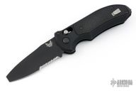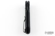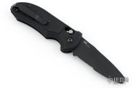 This Auto Triage Side Opening Axis Lock Auto has a black finished N680 drop point/ blunt tipped blade, as well as an auto opening 440C steel hook - both with safetys. Handle is black anodized aluminum with black G10 inlays, carbide glass breaker at butt, and black finished stainless steel tip up clip. Excellent condition. Comes with original box and papers.