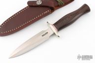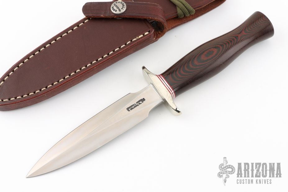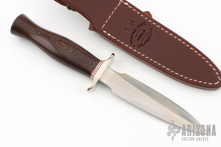 This Model 2-5 Dagger by Randall Made Knives features a double-edged satin finished blade with .158" stock and 1.049" blade depth, hidden tang construction. The handle has a nickel silver guard with red/duralumin spacers and a black/red linen micarta grip. Comes with a brown leather sheath. Excellent condition.
