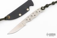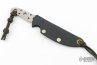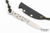 This neck knife by Dalton Holder features a satin finished blade and handle with .133" blade stock and .798" blade depth, full tang construction. The handle is skeletonized. Comes with a kydex neck sheath. Has some light scratches, otherwise excellent condition.