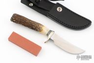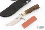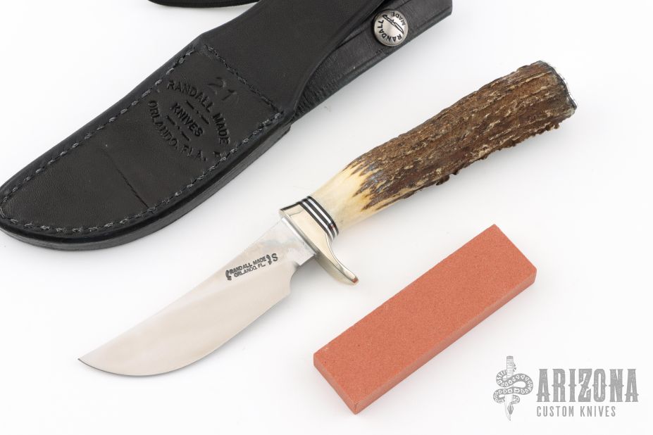 This Randall Made Model 21 has a satin finished upswept blade with notched thumbrest, .162" blade stock and a blade depth of .832", hidden tang construction. The handle has a nickel silver guard and butt plate, beautiful stag grip, black/aluminum spacers. Comes a black leather sheath and original paper wrapping. New from maker. This one has some really nice stag.
