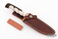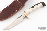 This Model 5-5 by Randall Made Knives features a satin finished blade with false top edge and notched thumbrest, .205" blade stock and 1.106" blade depth, hidden tang construction. The handle has a brass guard, finger groove stag grip red/brass spacers. Comes with original papers and brown leather sheath. New from maker.