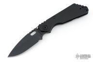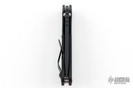 This Mick Strider SNG framelock folder features a black drop point blade with thumbhole and notched thumbrest. The handle has a black titanium frame with titanium clip, tip up carry. Jimping on blade spine. Includes Hinderer "Lock Bar Stabilizer" for maximum reverse lock retention. Nice detent, lockup and blade seating. New Condition.