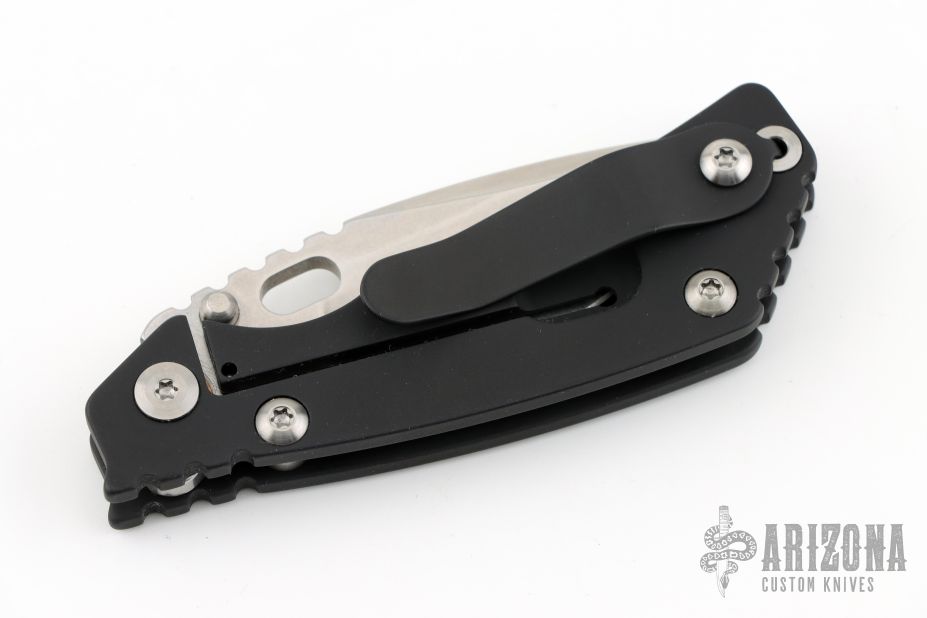 This PT by Mick Strider features a stonewashed blade with notched thumbrest and thumbhole. The handle has a DLC titanium frame with matching tip up clip. New condition.