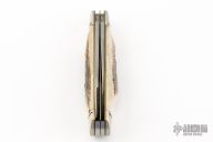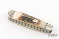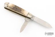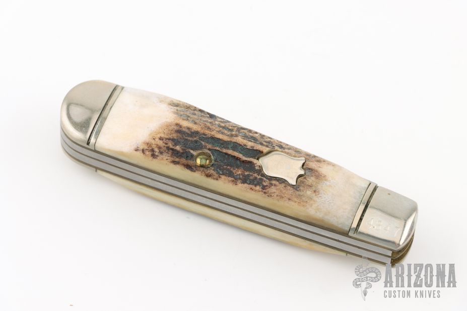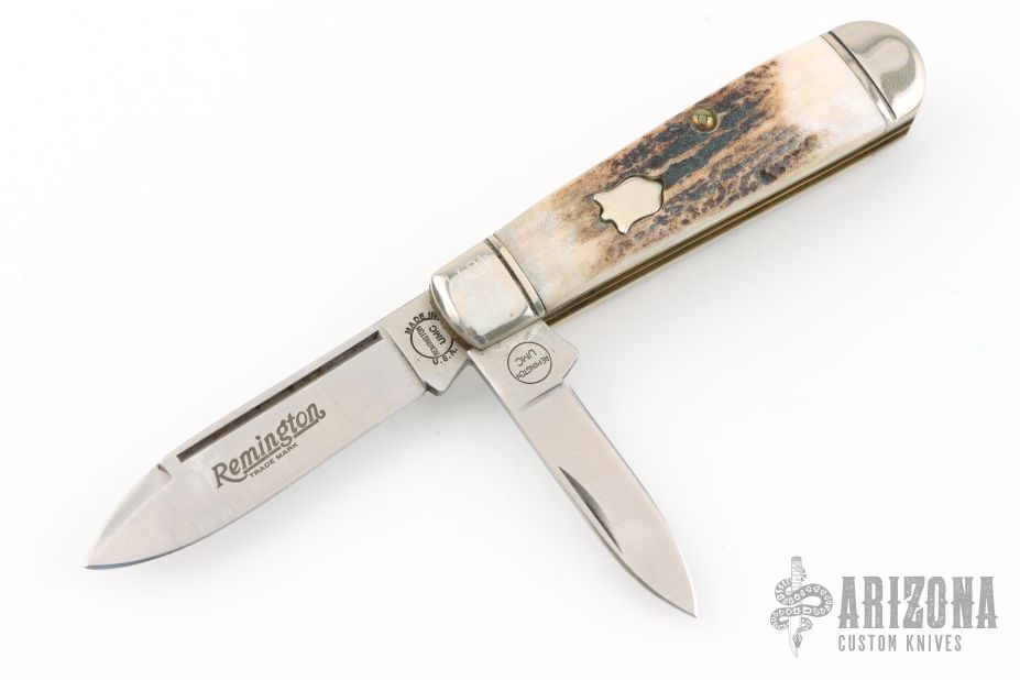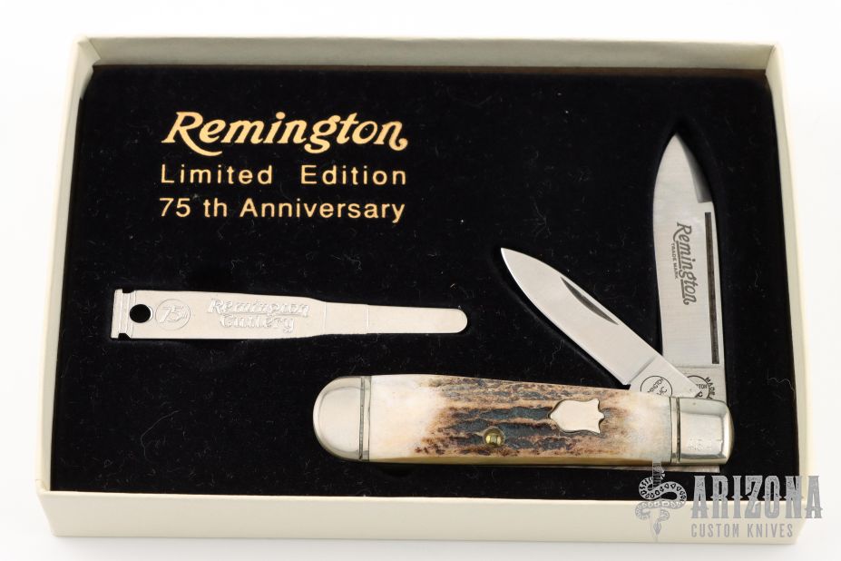 This 75th Anniversary Jack Knife by Remmington has two satin finished blades with nail nicks. The handle has nickel silver bolsters, stag covers, brass liners and steel springs.  Includes the original box and papers. #4847of 7500. Has some light scratches and patina, otherwise excellent condition.