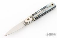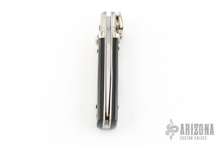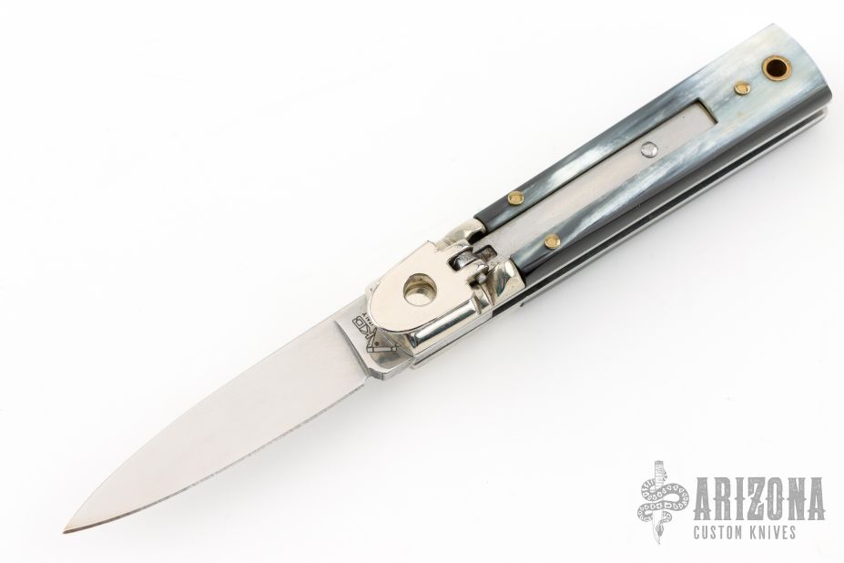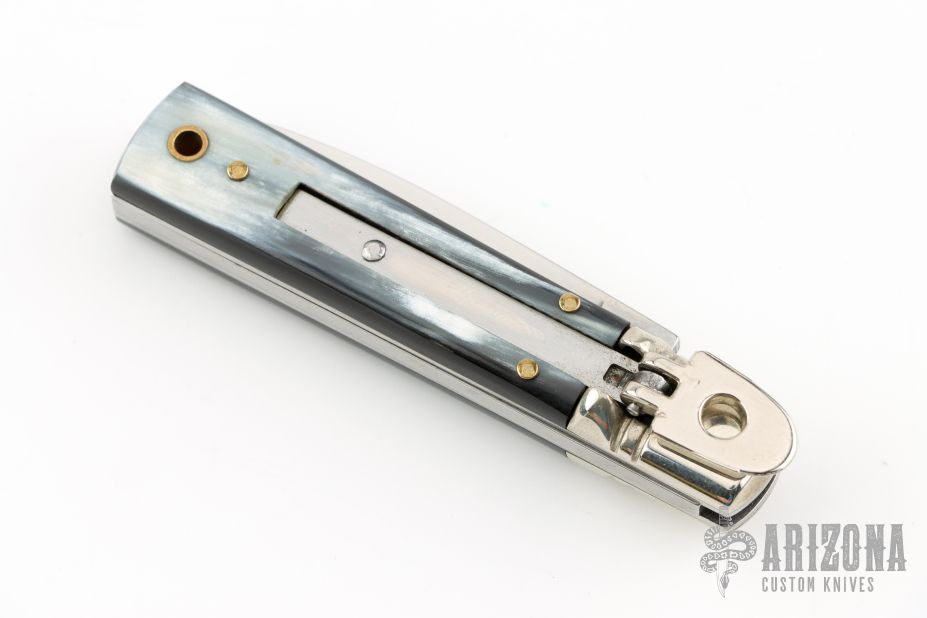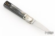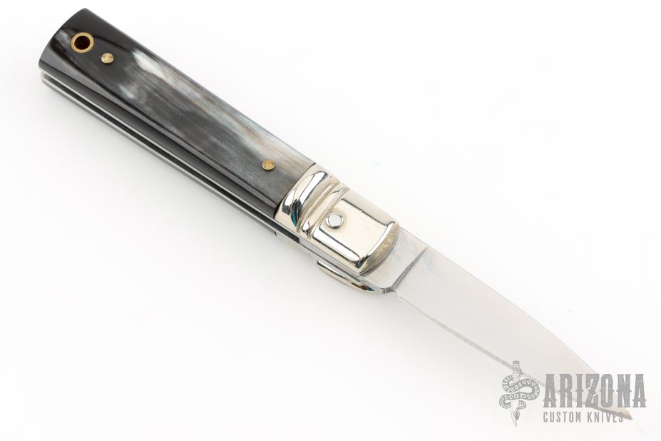 This small leverlock from AKC Italy features a drop point polished blade. The handle is comprised of nickel silver bolsters, buffalo horn scales, stainless steel liners and backspring. Excellent condition.