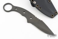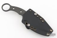 This Sakura by Ronin Blades was produced by Spartan Blades, it features a black Tungsten DLC coated blade with sharpened top edge and notched thumbrest, .186" blade stock and 1.293" blade depth, integral construction. Comes with a kydex sheath with Tek-Lok and red aluminum trainer. Has some light sheath marks, otherwise excellent condition.