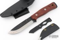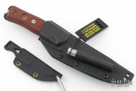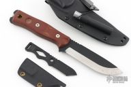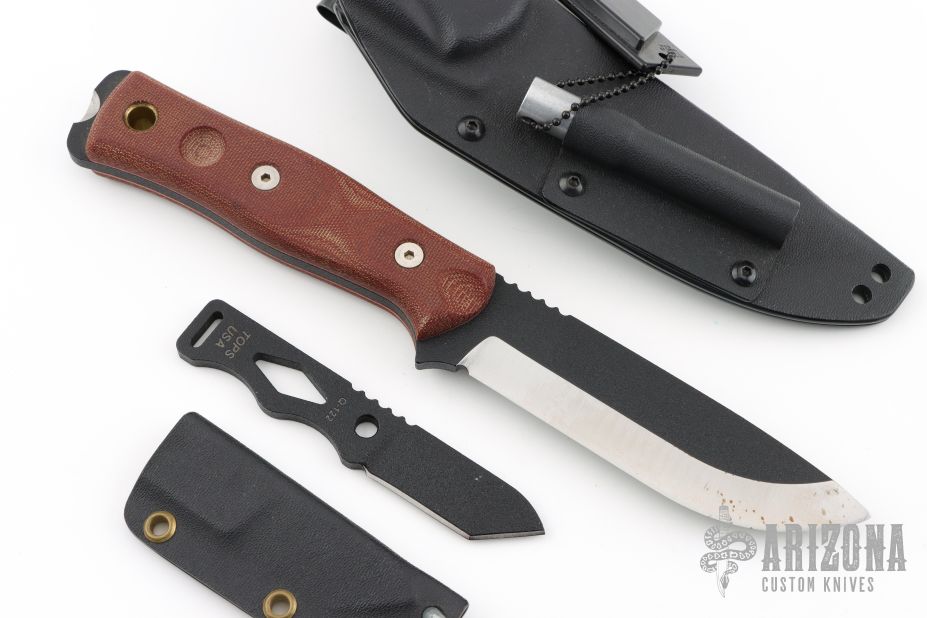 This Fieldcraft Fixed Blade was designed by Brothers of Bushcraft for TOPS knives. It features a two-tone blade with satin grinds with a notched thumbrest, .191" blade stock and 1.187" blade depth, full tang construction. The handle is comprised of natural canvas micarta over red liners and full tang construction. The handle features a bow drill divot on both scales and the exposed tang pommel features a divot ground into the tang to allow the scraping of a fire steel without having to leave the blade edge exposed. Includes a kydex sheath. Has some spots on the blade, otherwise excellent condition. Comes with a Tops Mini Tanto as well.