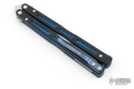 This Model 51 Morpho Balisong from Benchmade has a stonewash finished D2 stainless steel spear point blade. Handle is black G10 with blue jeweled/ anodized titanium liners and blue anodized titanium tip up clip. Excellent condition.