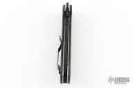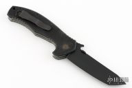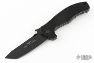 This Roadhouse by Emerson Knives has a black tanto blade with a thumbdisc and wave feature. The handle has textured black G-10 scales, titanium liners, black backspacer and a tip up black stainless steel clip. S/N 414. Has some scuffs on the clip. Comes with original box and papers. Excellent condition.