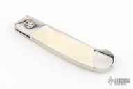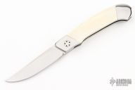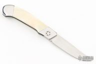 This knife by "KR" (please let us know if you know who this is) features a hand rub satin finished blade. The handle has stainless steel dovetailed bolsters, walrus ivory scales, stainless steel liners and backspacer. Has a couple light scratches, otherwise excellent condition.