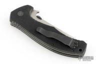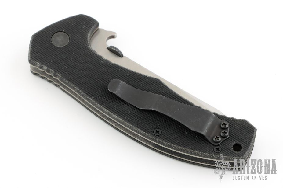 This Roadhouse by Emerson Knives has a tanto blade with a thumbdisc and wave feature. The handle has textured black G-10 scales, titanium liners, black backspacers and a tip up black stainless steel clip. S/N 1254. Has some scuffs on the clip. Comes with original box and papers. Excellent condition.