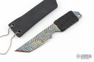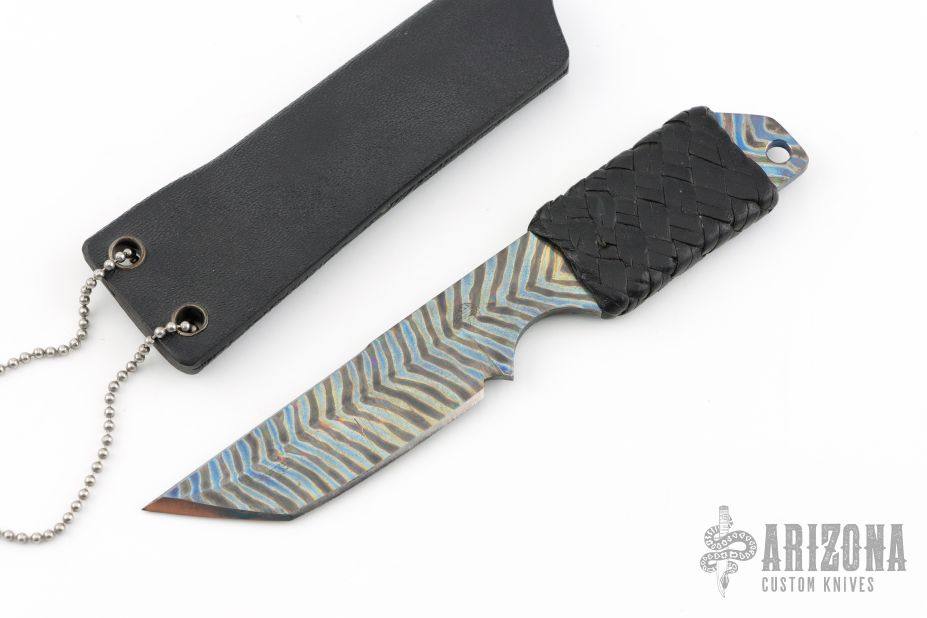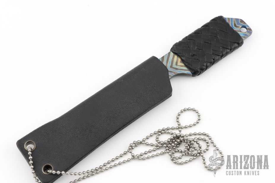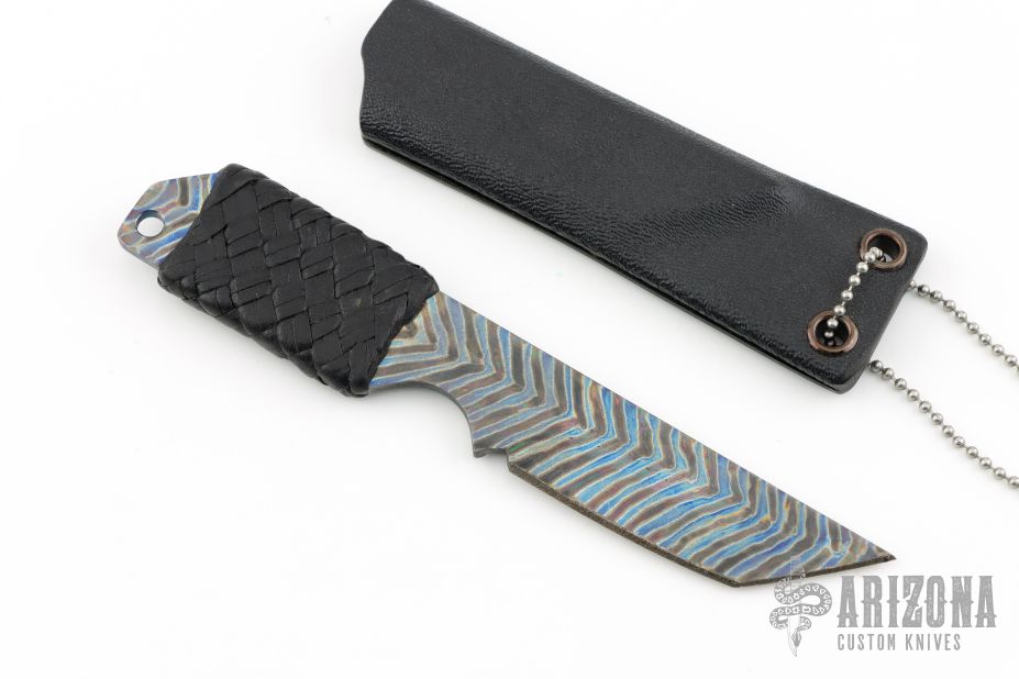 This knife by Strider Knives features a flamed titanium blade with chisel grind but the final edge is ground on both sides, .128" blade stock and .944" blade depth, full tang construction. The handle has a leather wrap that is very well done. Comes with kydex sheath. Has a couple light scratches, otherwise excellent condition.