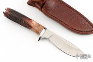 This Skinner from Greg Wardman features a hand rub satin finished blade with .182" blade stock and 1.205" blade depth, hidden tang construction. The handle has stainless steel guard and butt, stag grip with a maple spacers. Includes a hand tooled brown leather sheath with belt loop. Excellent condition. Beautiful knife.