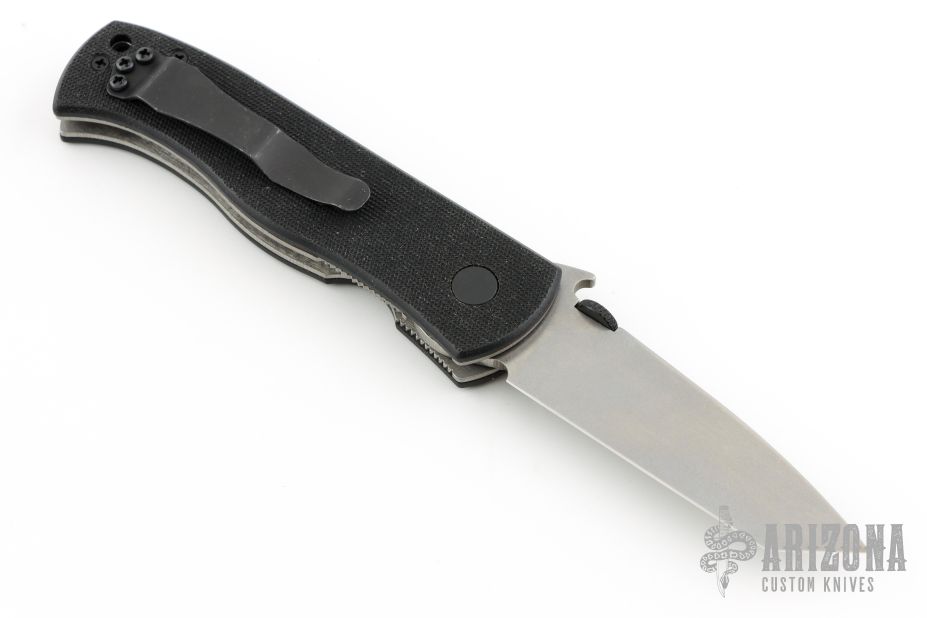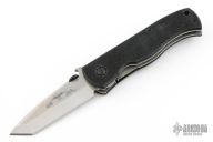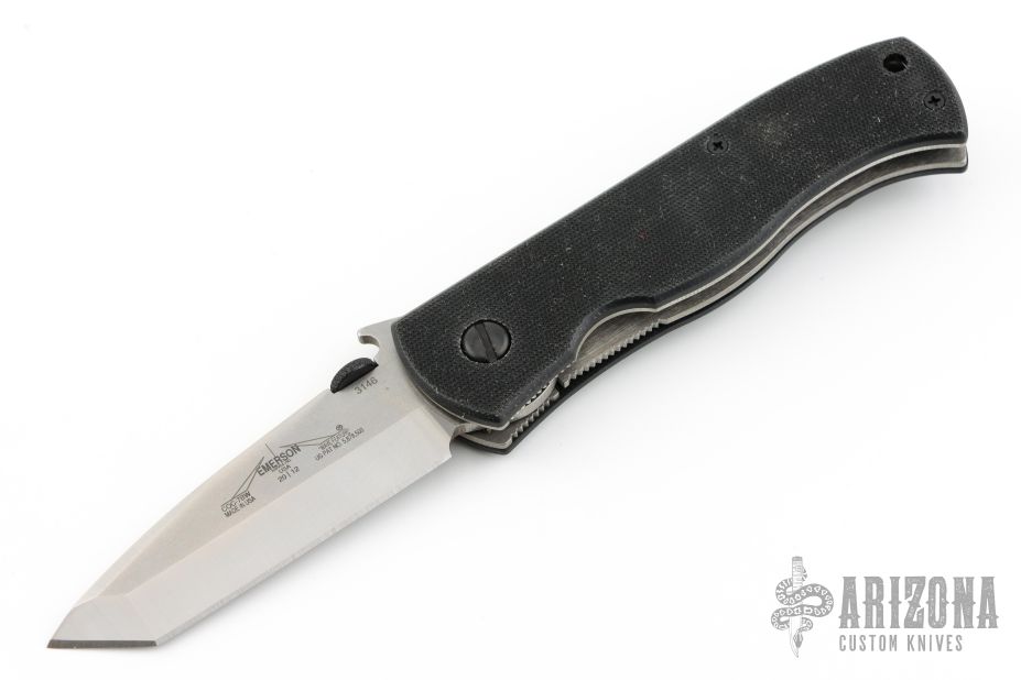 This CQC-7 by Emerson Knives features a stone wash finished chisel ground tanto blade, notched thumbrest, thumbdisc and wave feature. The handle has black G-10 scales, titanium liners, black backspacer and tip up black stainless steel clip, lanyard hole at the butt. S/N 3146. Comes with original box and papers. Has some scuffs on the clip, and handle. Excellent condition.