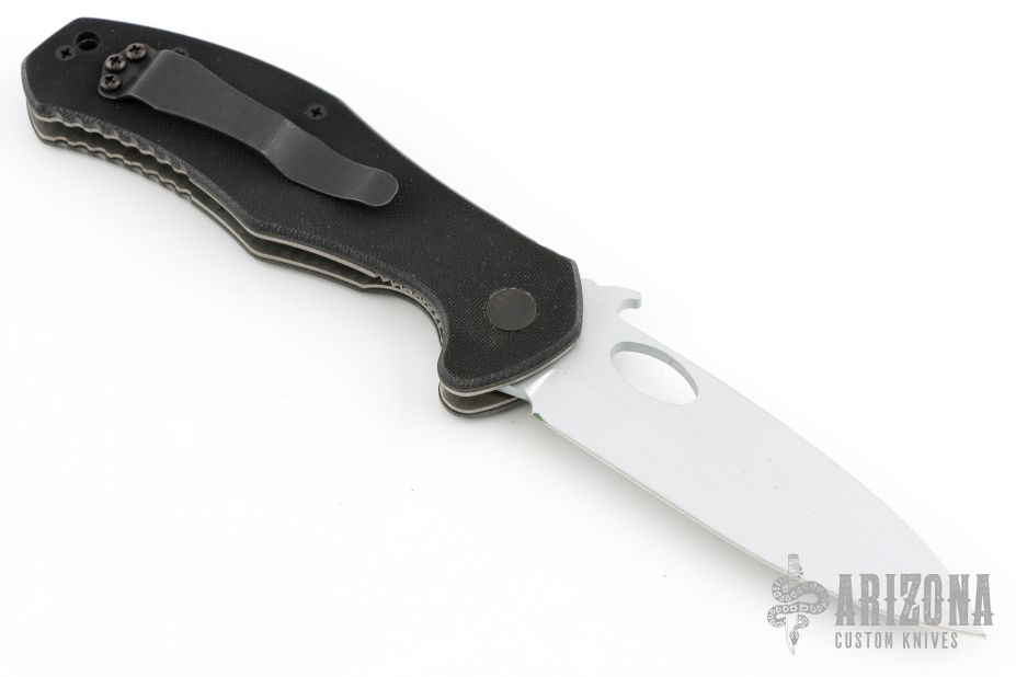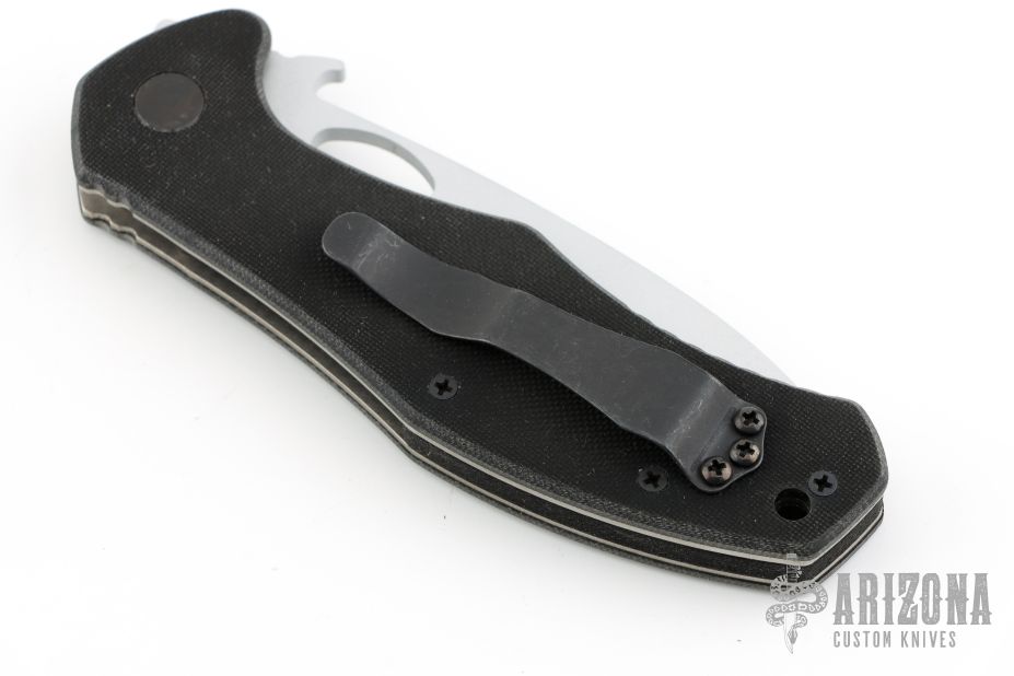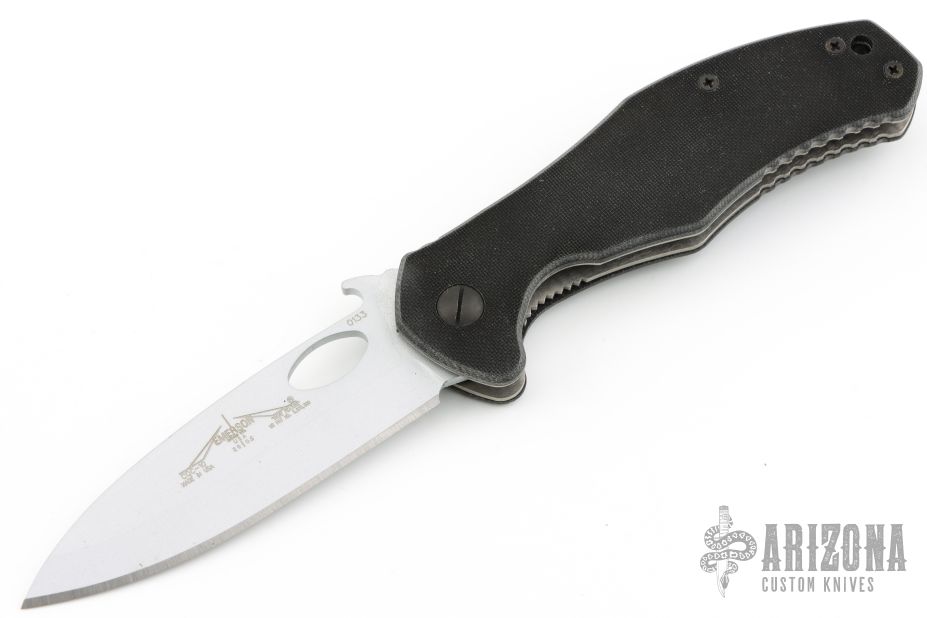 This CQC-10 SF by Emerson Knives has textured black G-10 scales. Stonewash/bead blast finished blade with thumbhole and wave feature. Black tip up clip. Serial #0133 and dated 2005. Comes with original box and papers. Has scuffs on the clip. Excellent condition.