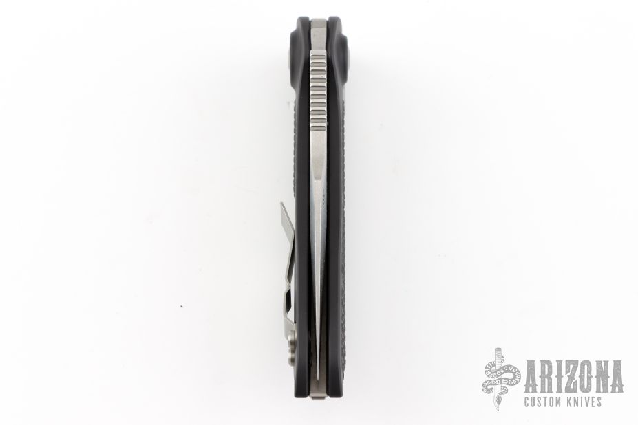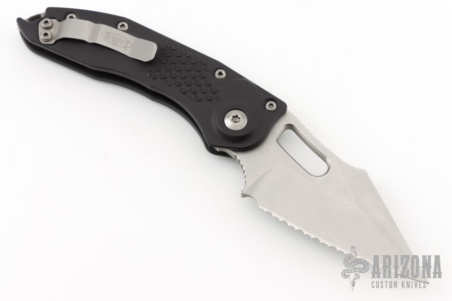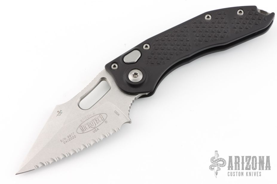 This Stitch Auto by Microtech Knives features a fully serrated stonewashed blade and false top edge, notched thumb and finger rests. The handle has a black milled aluminum handle with a bead blasted titanium backspacer and a bead blasted stainless  steel clip, tip up carry, lanyard hole at the butt. Comes with original box and papers. S/N of 9977 and dated 04/2022. Excellent condition.