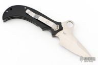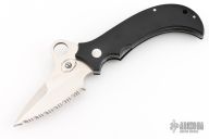 This knife by Spyderco is a Jotsingh Khalsa design, it features a satin finished fully serrated blade with a thumbhole. The handle has black paper micarta scales, stainless steel liners and a stainless steel tip down clip. Nice detent and blade seating. Excellent condition. #020