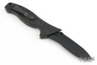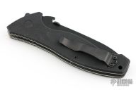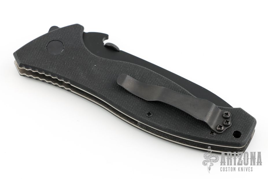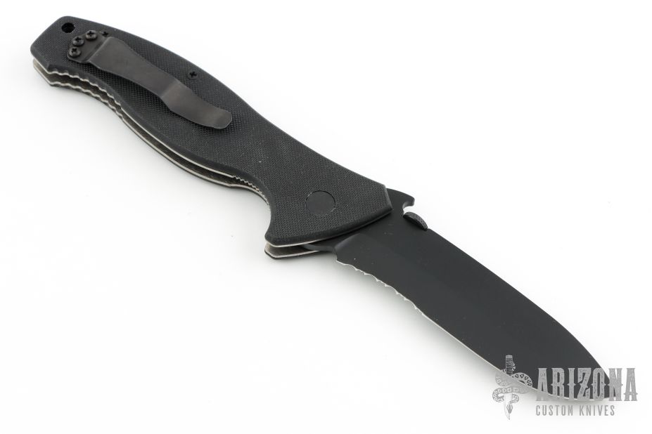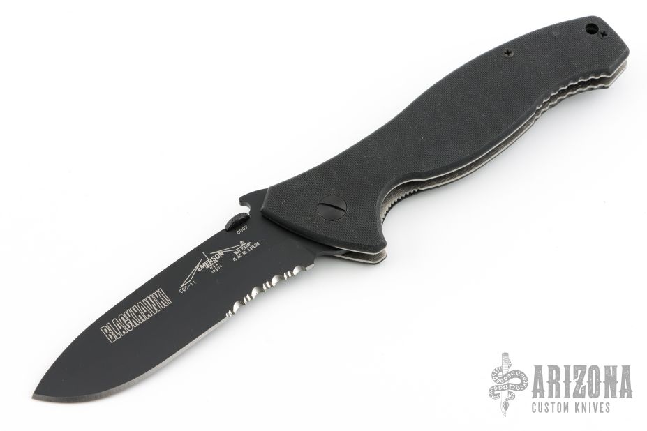 This Blackhawk CQC-11 linerlock folder by Emerson Knives has a partially serrated black blade and black G10 handle. Wave feature and thumbdisc. Includes original packaging and paperwork. Has scuffs on the clip. Excellent condition. #0007 and dated 2004.