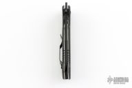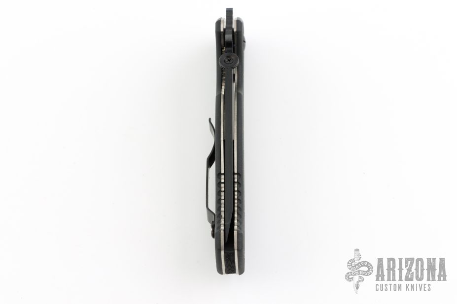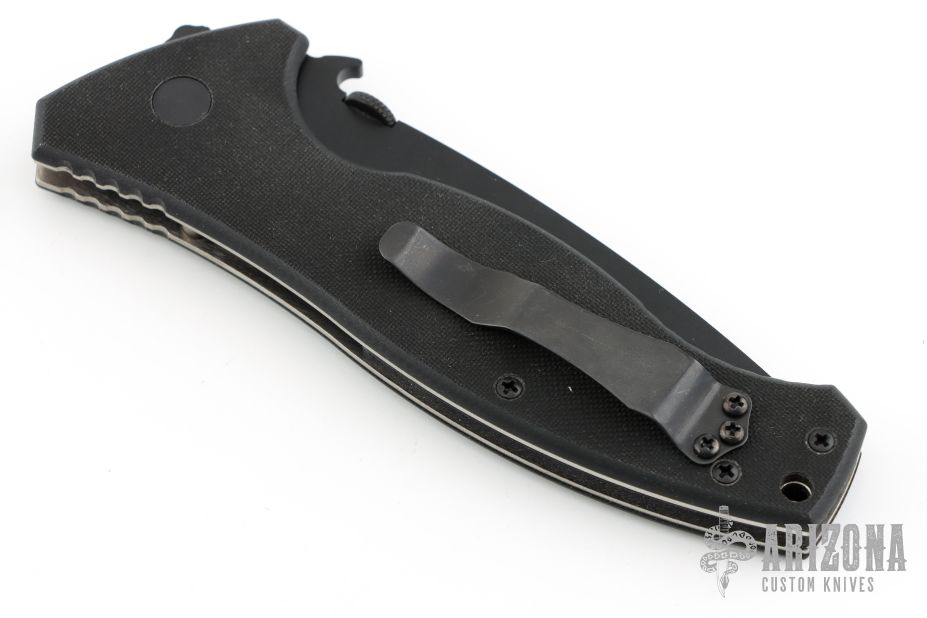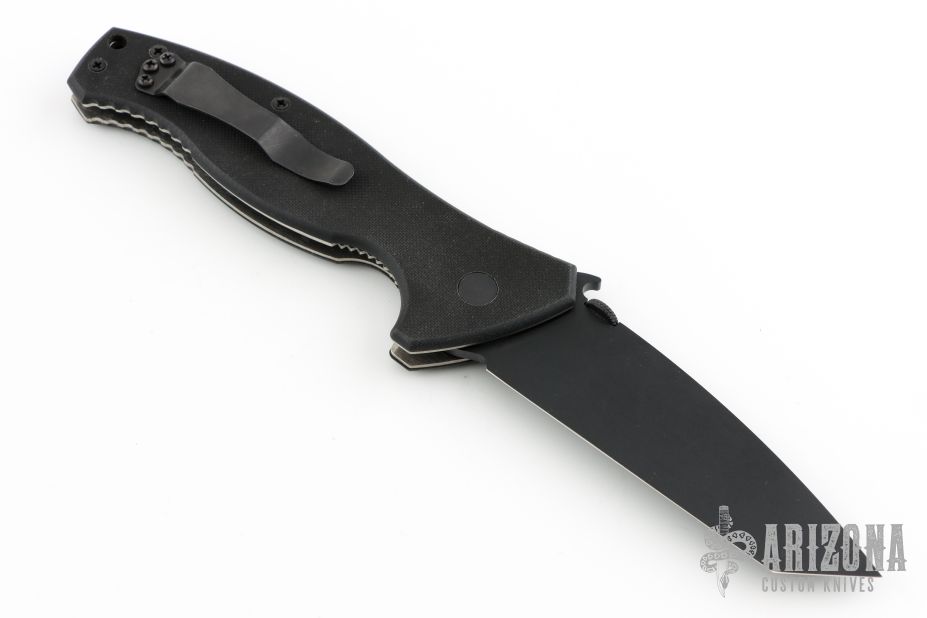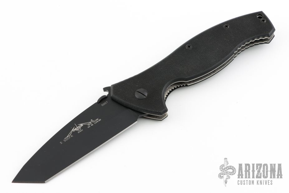 This production Super SOCFK linerlock folder has a black chisel ground tanto blade and G10 scales, titanium liners, and a black tip up clip. Wave feature. Has some scuffs on the clip. Excellent condition. #0007.