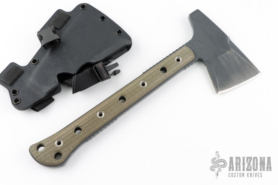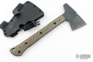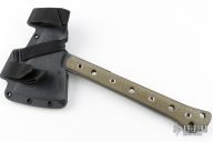 The 11.75" Jenny Wren Hammer Poll is compact outdoor multi-tool that fills the role of a high-quality outdoor cutting and chopping tool that will be your go to tool on a day hike, or a week long camping trip. Around the camp it’s a versatile tool for, cutting wood, food preparation, clearing your camp site, fire starting and any other cutting chores. The ax features a hammer poll for the obvious, hammering things like tent spikes and other things that need hammered! The Jenny Wren Hammer Poll offers full tang construction, 1/4" 80CRV2 carbon steel (57-58 HRC) is used in its construction. 3D contoured G10 handles scales are permanently mounted for durability. The tomahawk has our Tungsten Cerakote finish that grants greater resistance to wear, corrosion, chemical damage, and impact damage. The main edge measures 2 5/8", designed for the abuse of the field, chopping through anything you need cut, be it brush, branches, or any other chores that need the use of a sharp blade. We include a molded Kydex Bottom-Eject Scabbard with low ride straps for belt carry. Has some scuffs and scratches, has been used, otherwise good condition. Dated OCT 2013