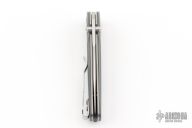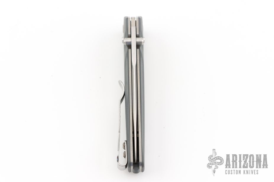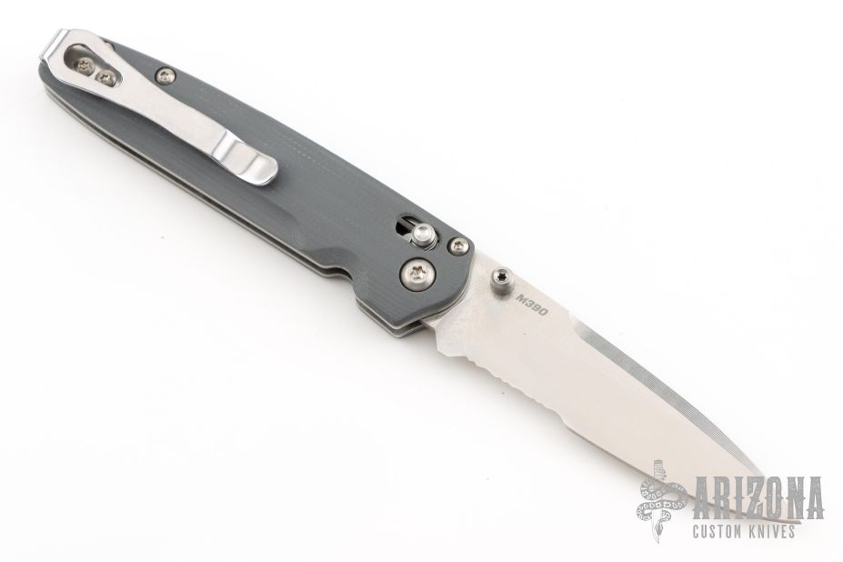 This 485s Valet by Benchmade has a tumble finished spear point blade with dual thumbstuds and serrations. The handle has grey G-10 scales, stainless steel liners, grey G-10 backspacer, lanyard hole and tip up stainless steel clip. Comes with original drawstring bag, box and papers. Has a couple light scuffs, otherwise Excellent condition.