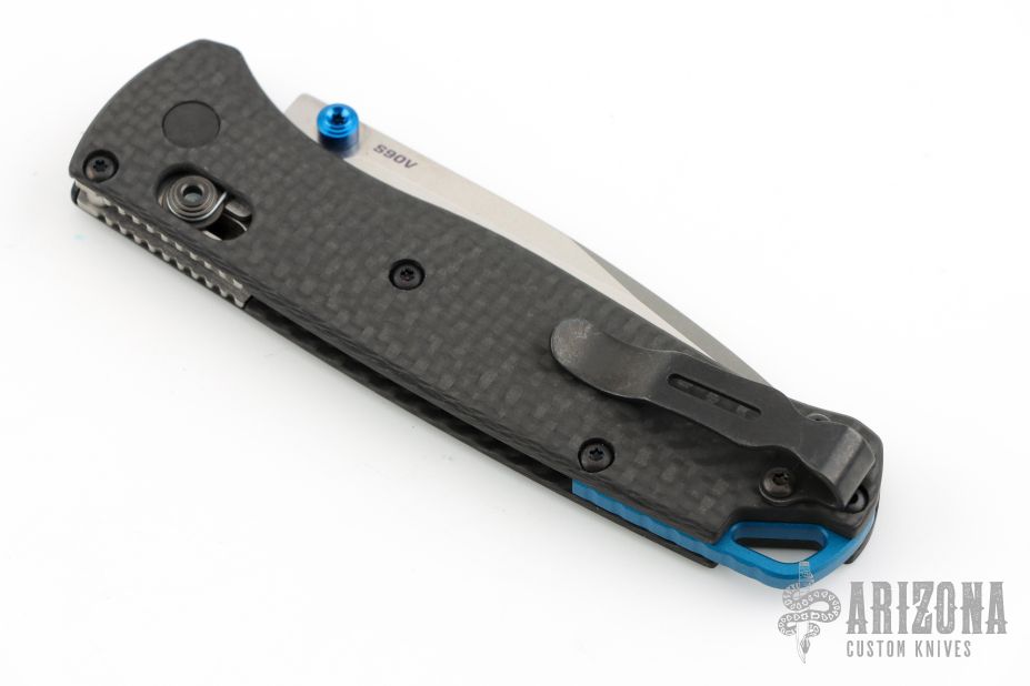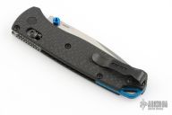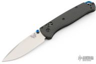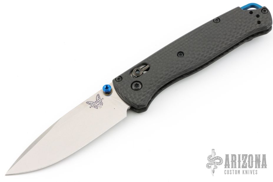 The 535-3 Bugout knife is built with a carbon fiber handle and a satin finished blade with a plain cutting edge.