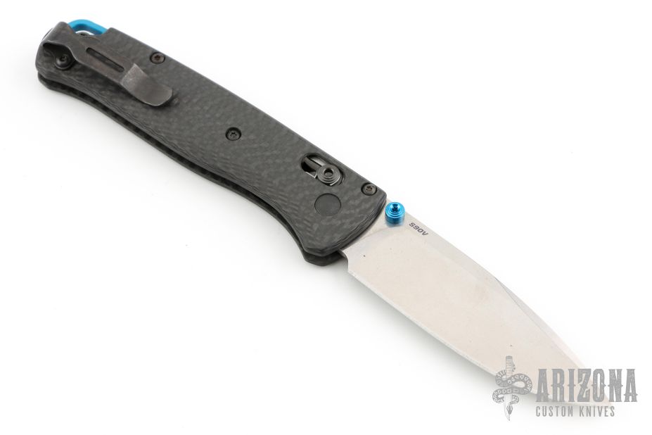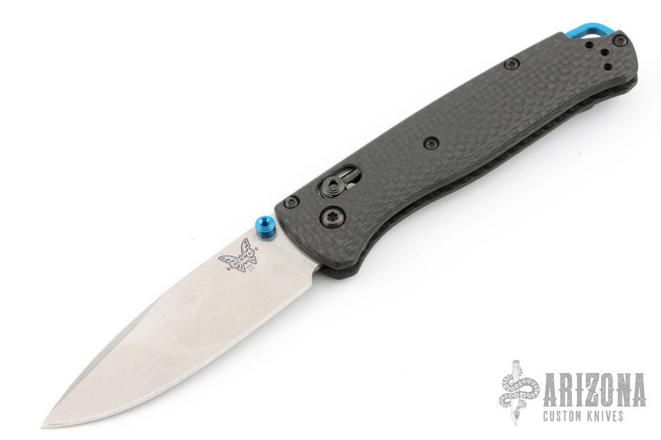 The 535-3 Bugout knife is built with a carbon fiber handle and a satin finished blade with a plain cutting edge.