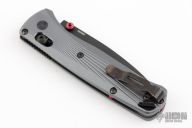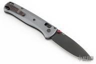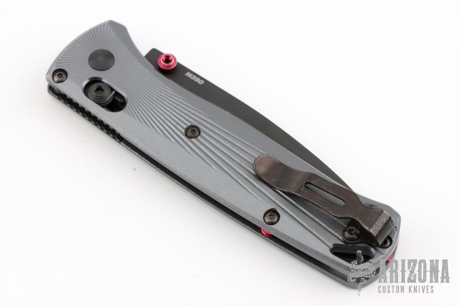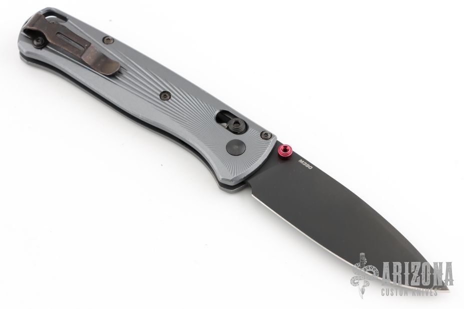 The Bugout features a drop point blade with a flat dark Cerakote finish. It's a manual opener with ambidextrous thumb studs. This AXIS lock has a milled aluminum frame and black hardware, a black mini deep-carry pocket clip, and a lanyard hole. Includes original box, pouch and papers. Excellent Condition.