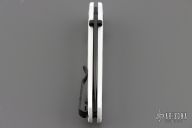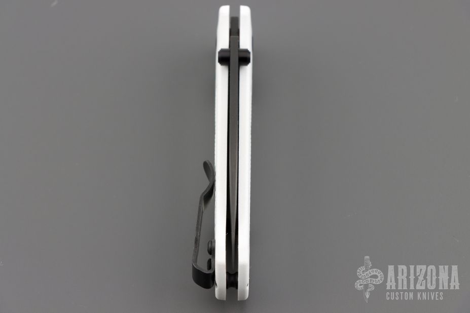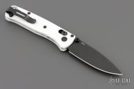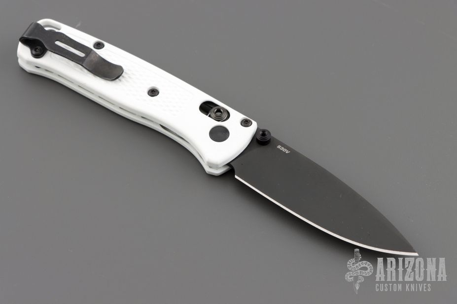 The Mini Bugout features a drop point blade with a flat dark Cerakote finish. It's a manual opener with ambidextrous thumb studs. This AXIS lock has a white frame and black hardware, a black mini deep-carry pocket clip, and a lanyard hole. Includes original box, pouch and papers. Excellent Condition.