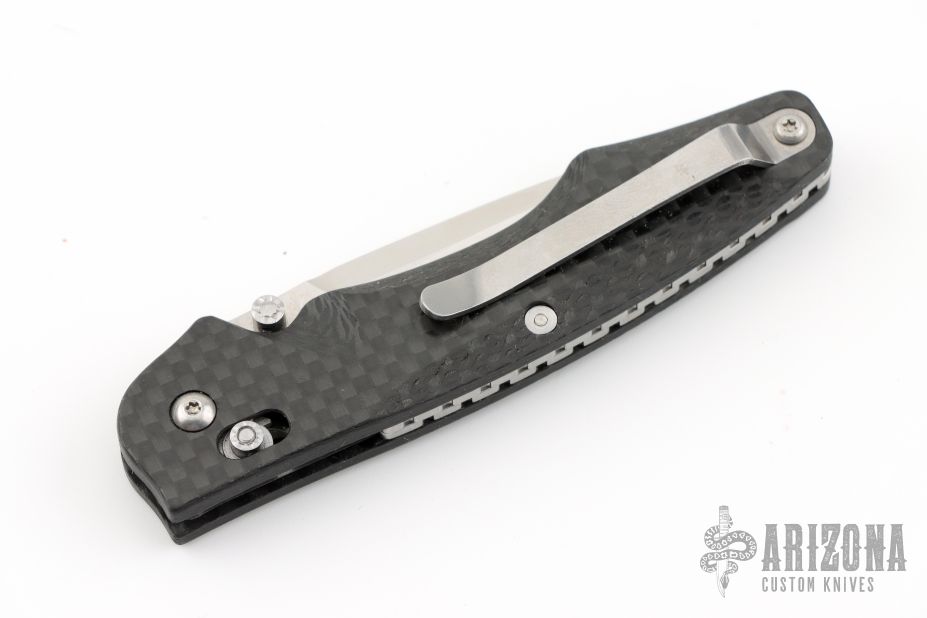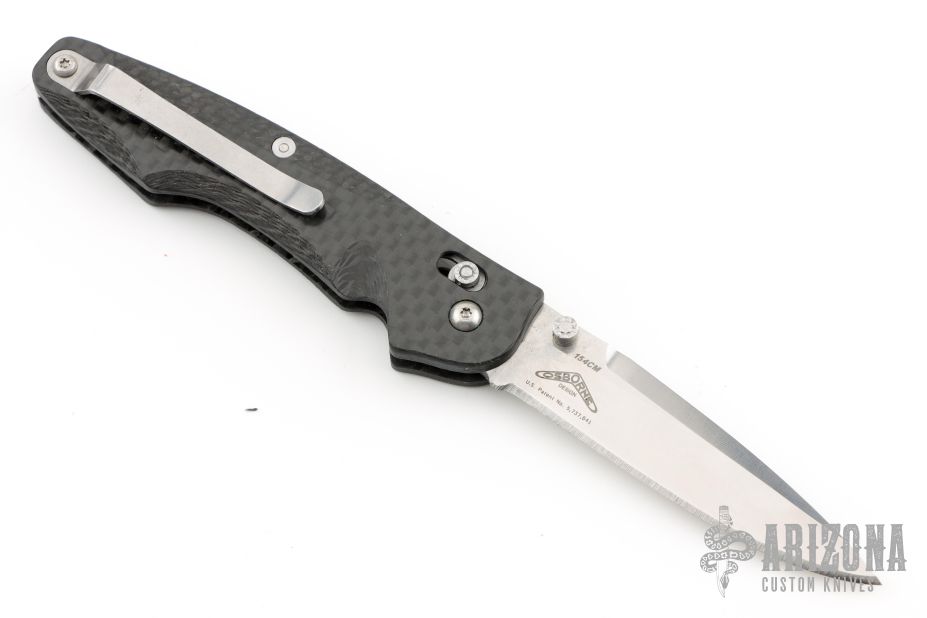 This Benchmade Osborne 771 features a satin finished drop point blade. The handle has a carbon fiber frame with a stainless steel pocket clip. Comes with original box and papers. Has some light scratches, otherwise Excellent Condition.