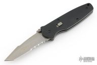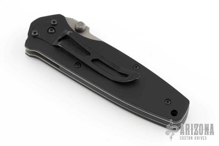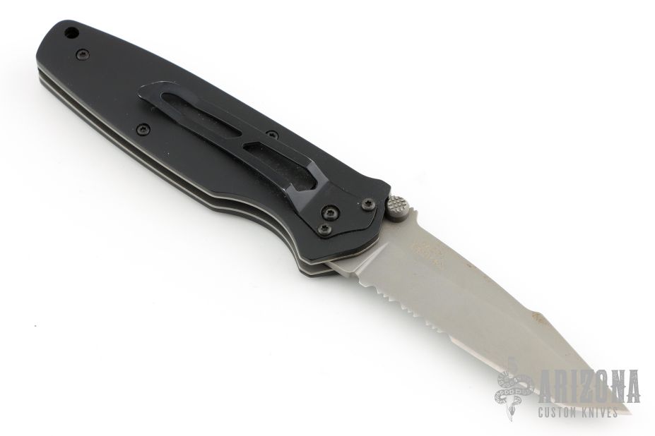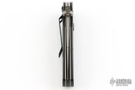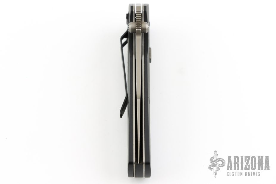 This knife by Timberline Knives features a bead blast finish clip point blade with notched thumbrest and dual thumbstuds. The handle has black scales, stainless liners, lanyard hole at the butt, tip up stainless steel clip. Has some scuffs, good condition otherwise. The action is okay, you can feel the spring pull upon opening. Probably needs some oil. Lock released by pushing the lever towards the blade.