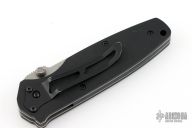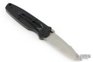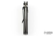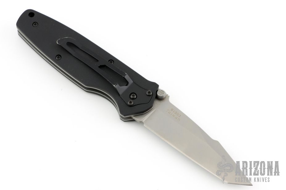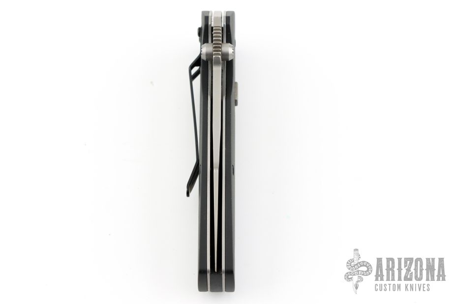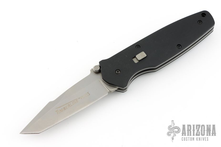 This knife by Timberline Knives features a bead blast finish clip point blade with notched thumbrest and dual thumbstuds. The handle has black scales, stainless liners, lanyard hole at the butt, tip up stainless steel clip. Has some scuffs, great condition otherwise. Lock released by pushing the lever towards the blade.