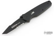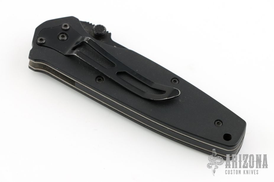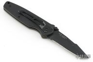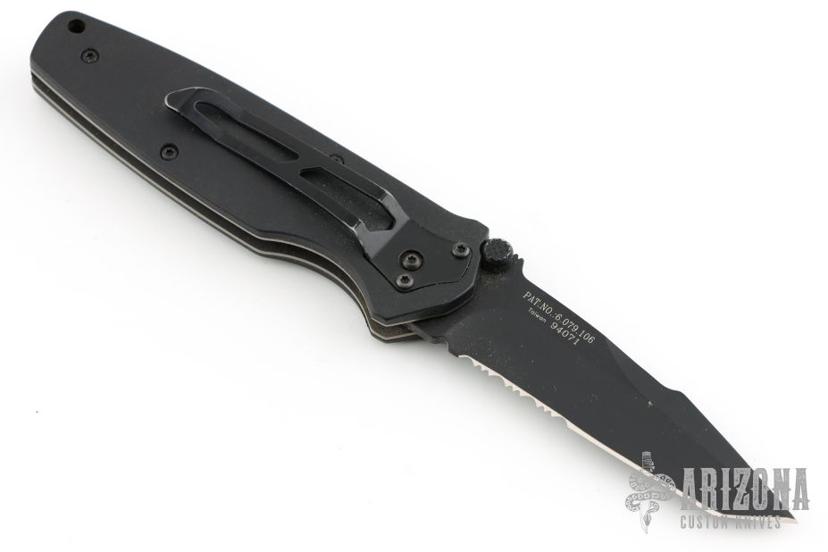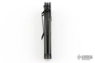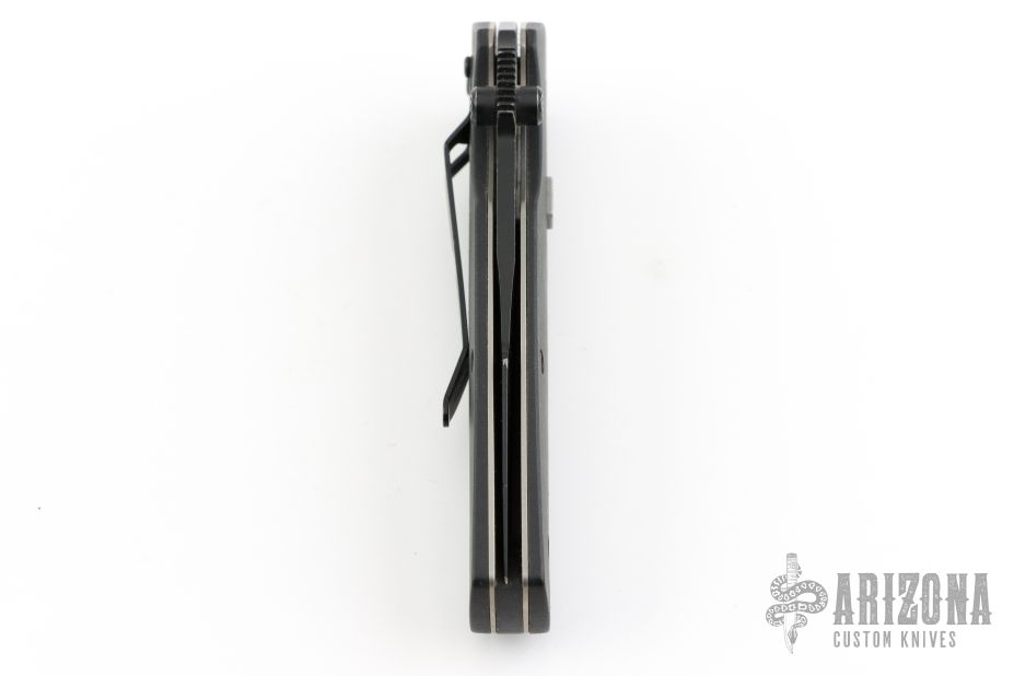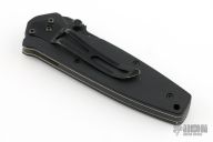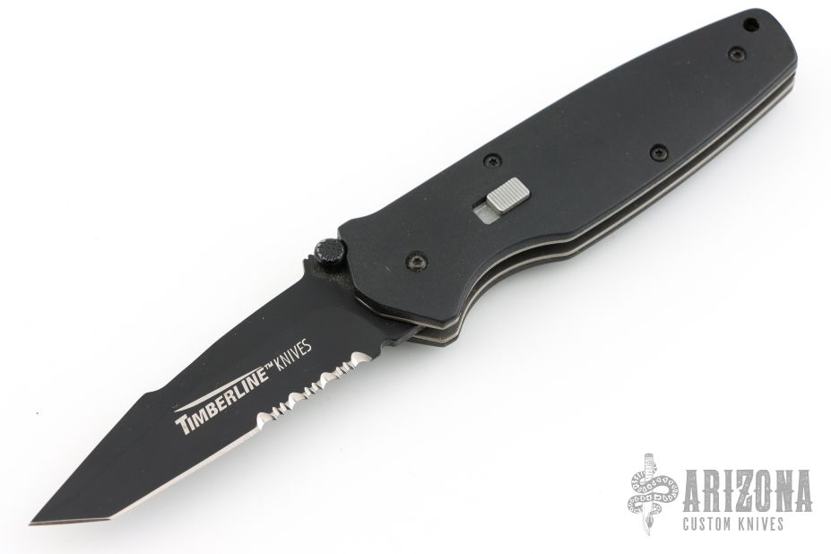 This knife by Timberline Knives features a bead black finished clip point blade with notched thumbrest and dual thumbstuds. The handle has black scales, stainless liners, lanyard hole at the butt, tip up stainless steel clip. Has some scuffs, good condition otherwise. The action is okay, you can feel the spring pull upon opening. Probably needs some oil. Lock released by pushing the lever towards the blade.
