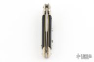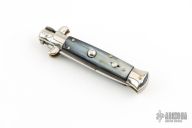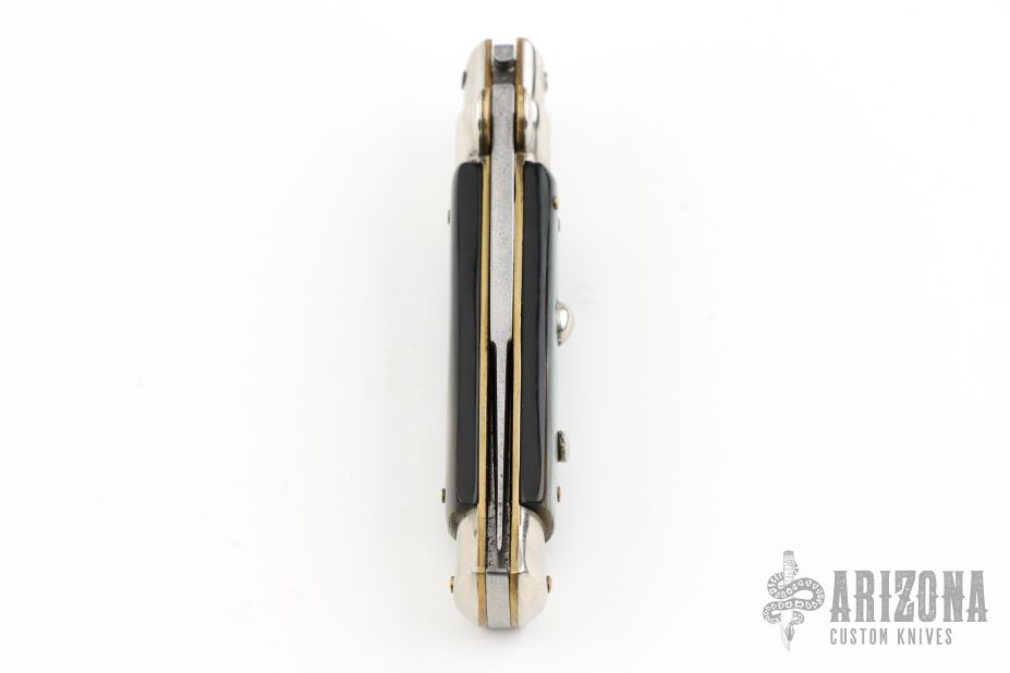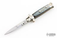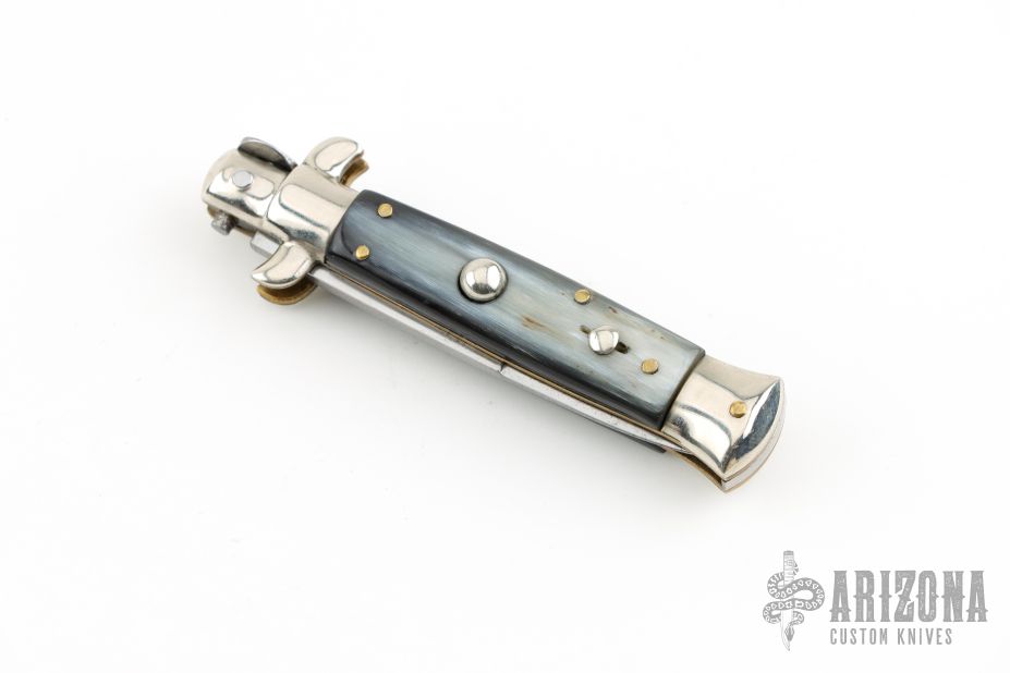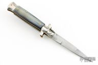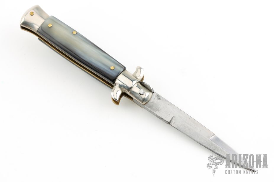 This vintage picklock automatic by Mauro Mario features a bayonet ground blade with false top edge. The handle has nickel silver bolsters, buffalo horn scales, D-stamped brass liners, steel backspacer. Has safety. Nice action. Has been rescaled, and resharpened. Has scratches and patina, otherwise great condition for its age.