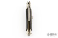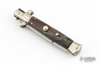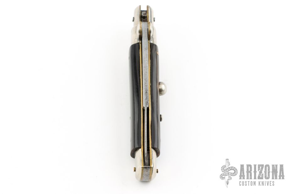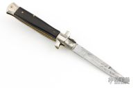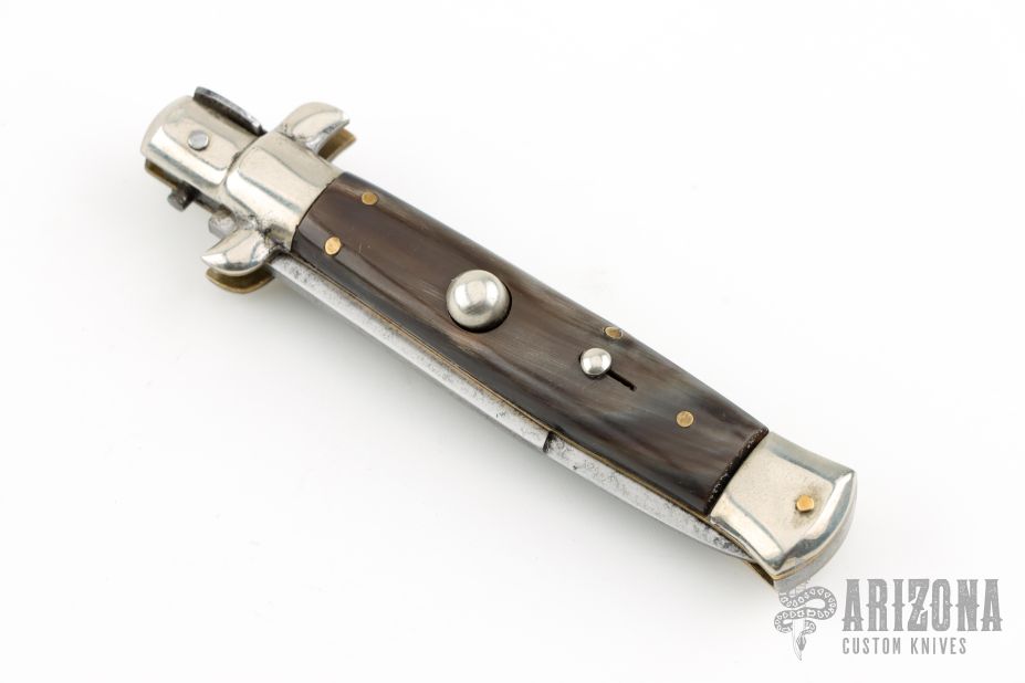 This Picklock Auto was made in Italy and features a bayonet ground blade with false top edge. The handle has nickel silver bolsters and pommel with buffalo horn scales, D-stamp brass liners and steel backspacer. Has scratches and oxidation, otherwise good condition for its age.