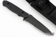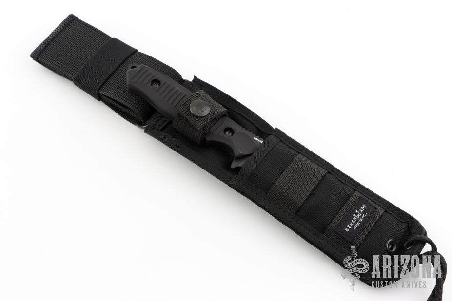 This Nimravus by Benchmade has a black tanto blade with partially serrated edge, 1/8" blade stock and 1 1/8" blade depth, full tang construction with black aluminum scales and lanyard hole. Nylon tactical belt sheath. Allen Elishewitz design. Excellent condition. Comes with original box, sheath and papers.
