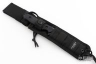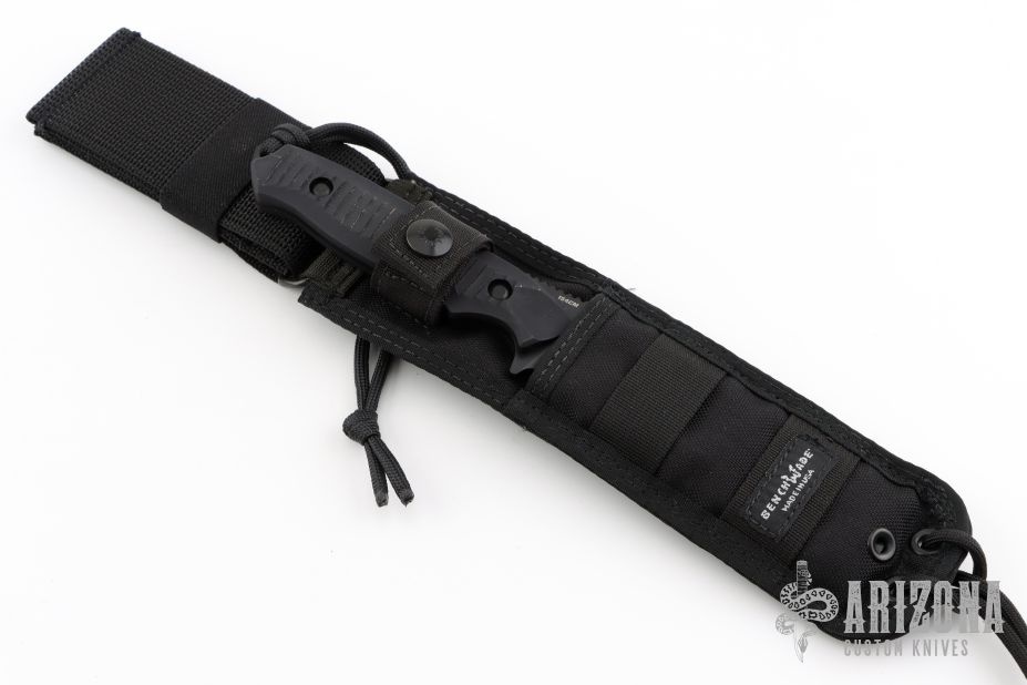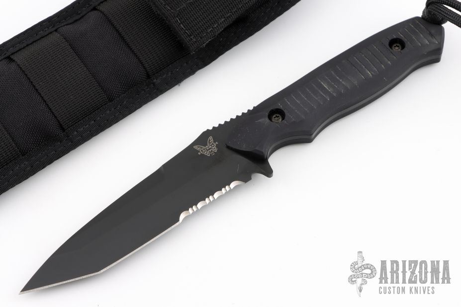 This Nimravus by Benchmade has a black tanto blade with partially serrated edge, 1/8" blade stock and 1 1/8" blade depth, full tang construction with black aluminum scales and lanyard hole. Nylon tactical belt sheath. Allen Elishewitz design. Excellent condition. Comes with 1141SBKSN box, sheath and papers.
