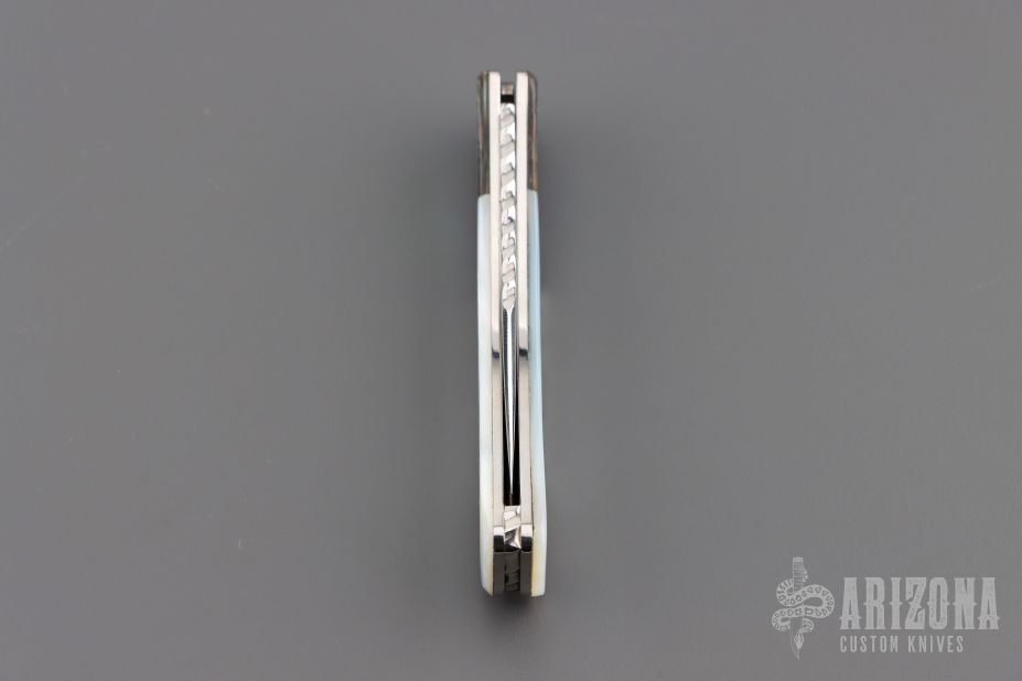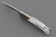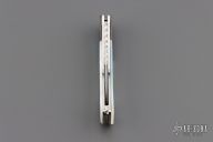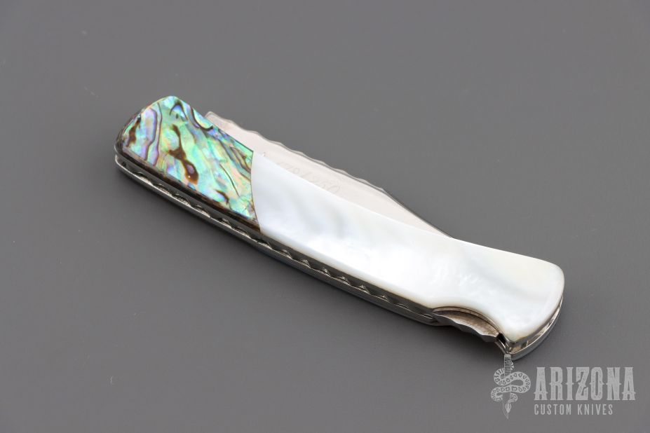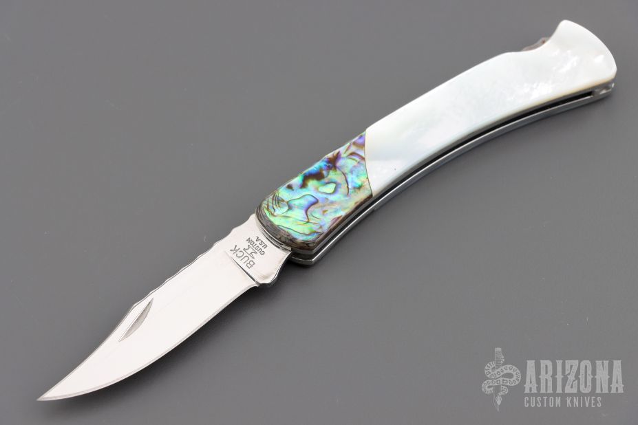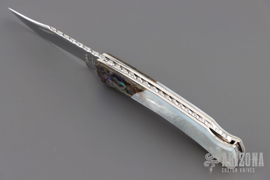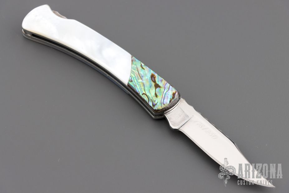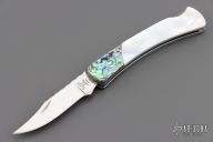 This Buck 55 features a mirror finished blade with nail nick and file worked blade spine. The handle has mirror polished nickel silver liners, abalone bolsters, and pearl covers, file worked stainless steel rocker bar. Comes with original box and papers. Excellent condition.