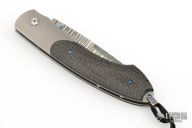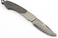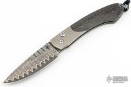 This folder by William Henry features a bead blasted  titanium frame with carbon fiber inlays. Sapphire inlays in thumb stud and push button. The push button releases the lock and allows you to close the knife. The drop point blade is San Mai Wave Damascus with ZDP189 core. Includes the original box, sheath, and COA dated August 17, 2007. Excellent condition.