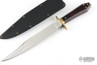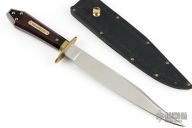 This is a discontinued Bill Bagwell designed Gambler Bowie, made by Ontario Knife Company. Features a satin finished clip point blade with a nearly sharpened top edge, .286" blade stock and 1.245" blade depth, hidden tang construction. The handle has a brass guard/collar/studs, and a dymondwood grip. Includes original black leather sheath and box. Has some light scuffs and patina. Excellent condition otherwise.