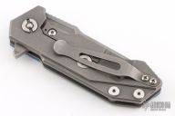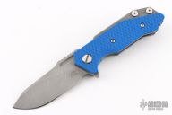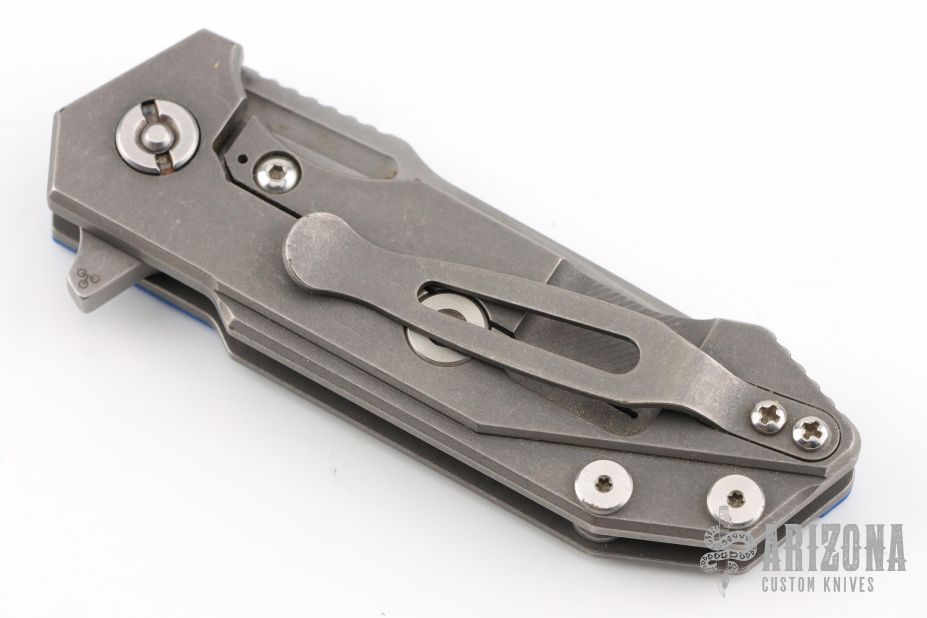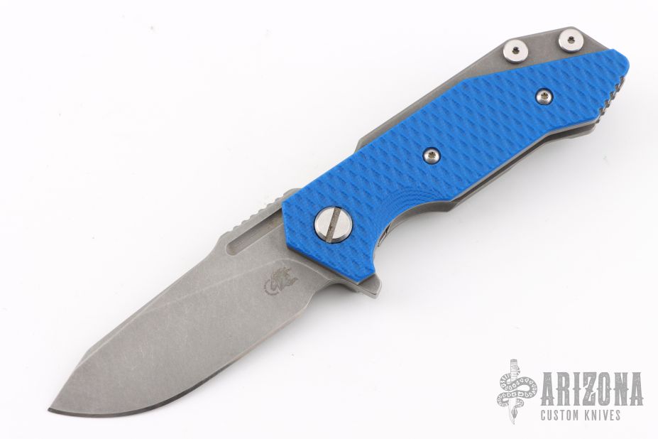 This Half Track from Hinderer Knives features an acid/tumble finished slicer blade with swedge, fullers, notched thumbrest and flipper. The handle is comprised of an acid/tumble finished titanium frame complemented by a blue G-10 scale. Titanium clip is positioned for tip up, right hand carry. Excellent condition. Comes with extra micarta scale, and extra set of washers. Has some scuffs and scratches, great condition otherwise.