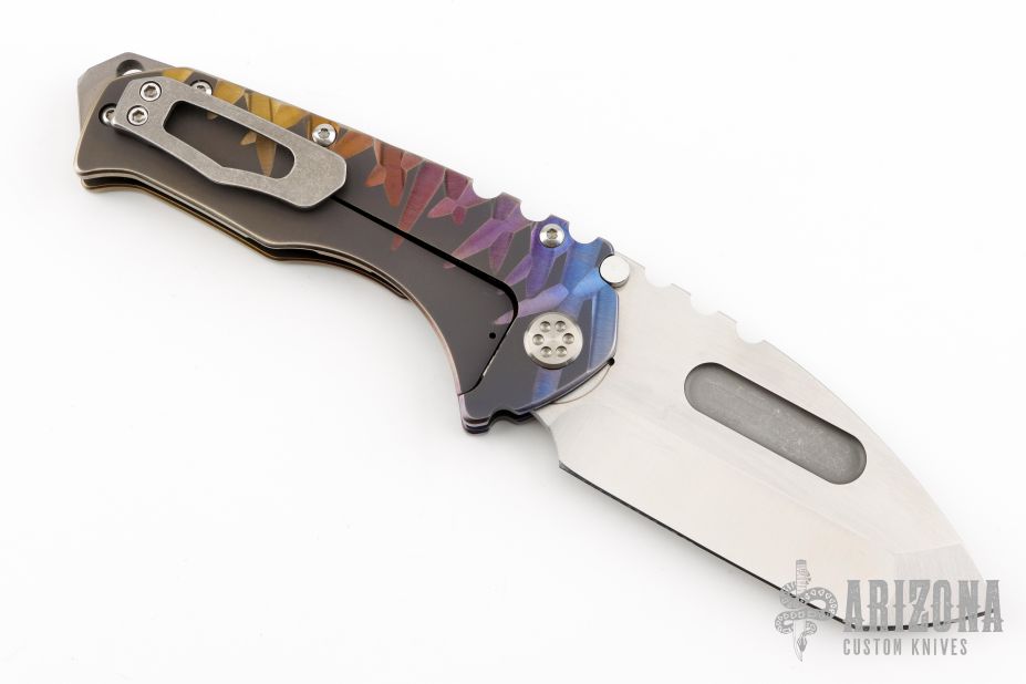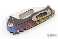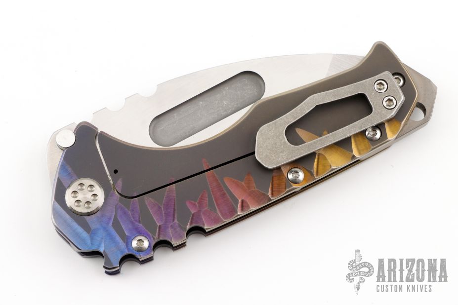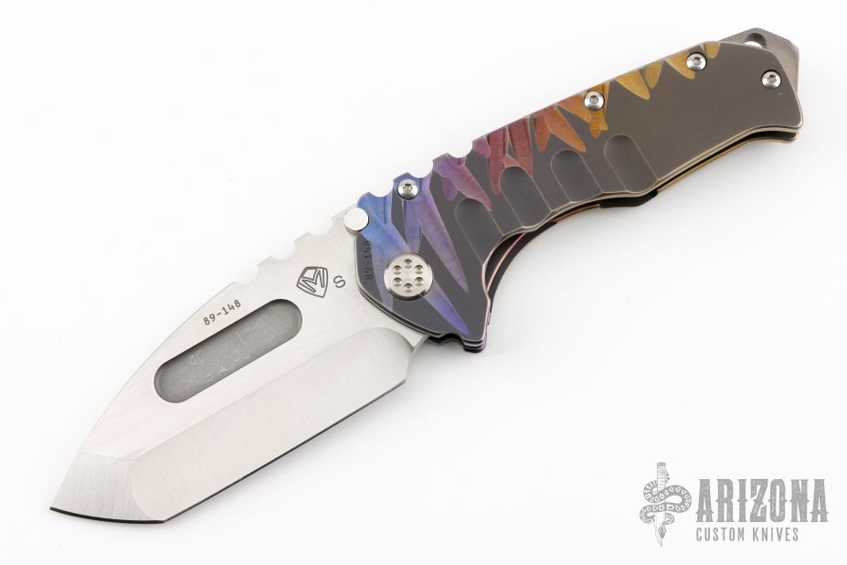 The Praetorian is a Marquee knife. It is a TON of blade in a relatively small package. This design incorporates aerospace materials, space age coatings, old school metallurgy, thoughtful design and hand craftsmanship that is rare but alive and strong in this modern world. This knife features a satin finished drop point tanto blade. This particular knife features an anodized finished titanium frame, slender titanium scales, all titanium hardware, and titanium clip. Comes with hard case and original box. Excellent Condition.