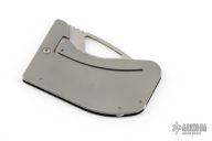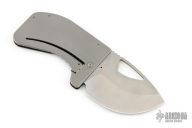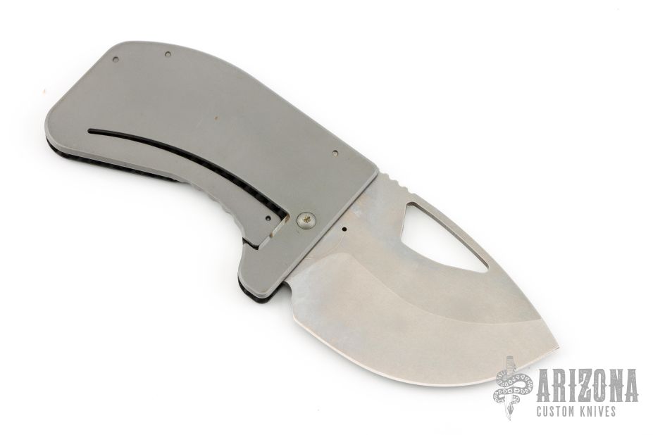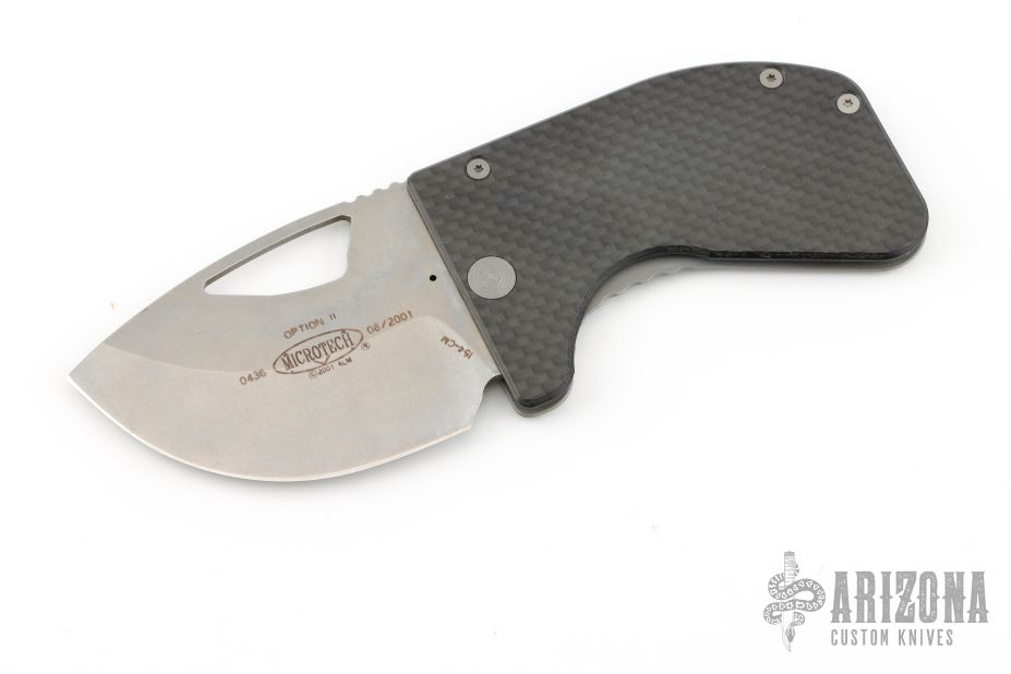 This Option II folder by Microtech features a stonewashed plain edge blade with notched thumbrest and a thumbhole. The handle is stainless steel with frame lock closure on one side and carbon fiber on the other. Dated 08/2001 and S/N 0436. Has some light scuffs and scratches, great condition otherwise.