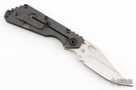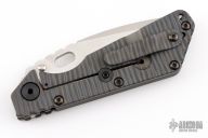 This SMF framelock folder by Mick Strider features a two-tone spear point blade and a dimple pattern grey aluminum and flamed titanium frame and tip up titanium clip. Includes a "Lock Bar Stabilizer" for maximum reverse lock retention. Nice detent, lockup and blade seating. Excellent condition.