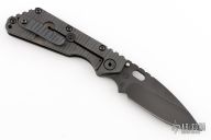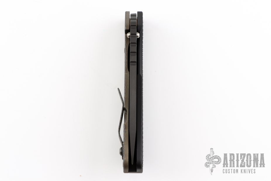 This SMF framelock folder by Mick Strider features a black drop point blade and a dimple pattern aluminum and flamed titanium frame and tip up titanium clip. Includes a "Lock Bar Stabilizer" for maximum reverse lock retention. Nice detent, lockup and blade seating. Excellent Condition.