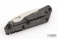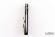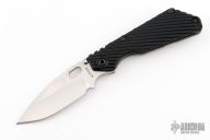 This SNG framelock folder by Mick Strider features a stonewashed blade and a Riffle pattern black G-10 and stonewashed titanium frame and tip up titanium clip. Includes a "Lock Bar Stabilizer" for maximum reverse lock retention. Nice detent, lockup and blade seating. Excellent condition.