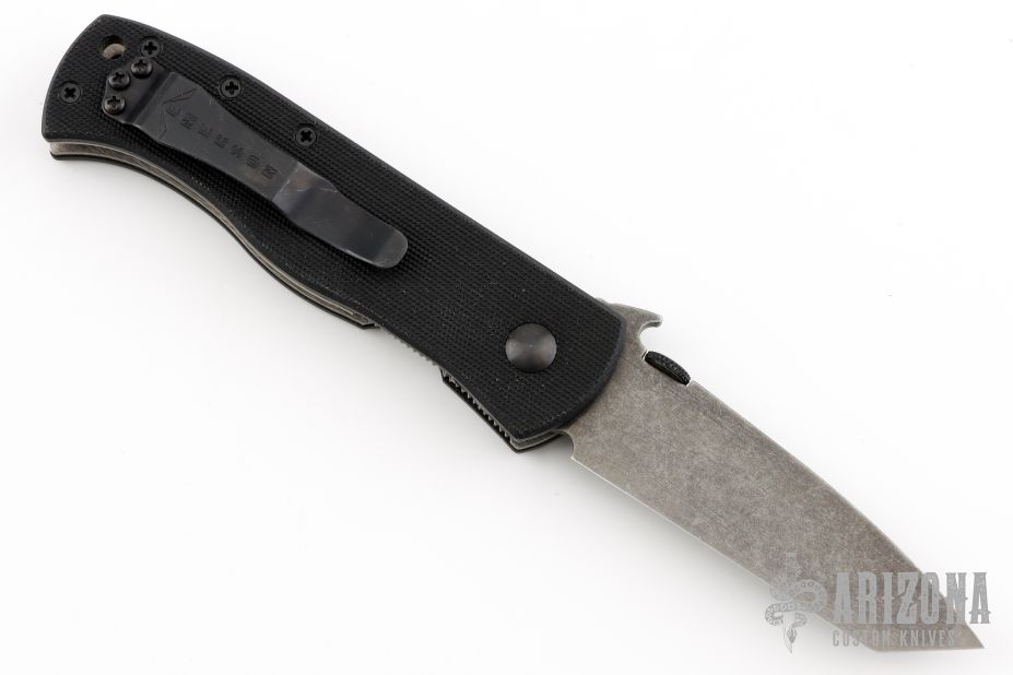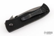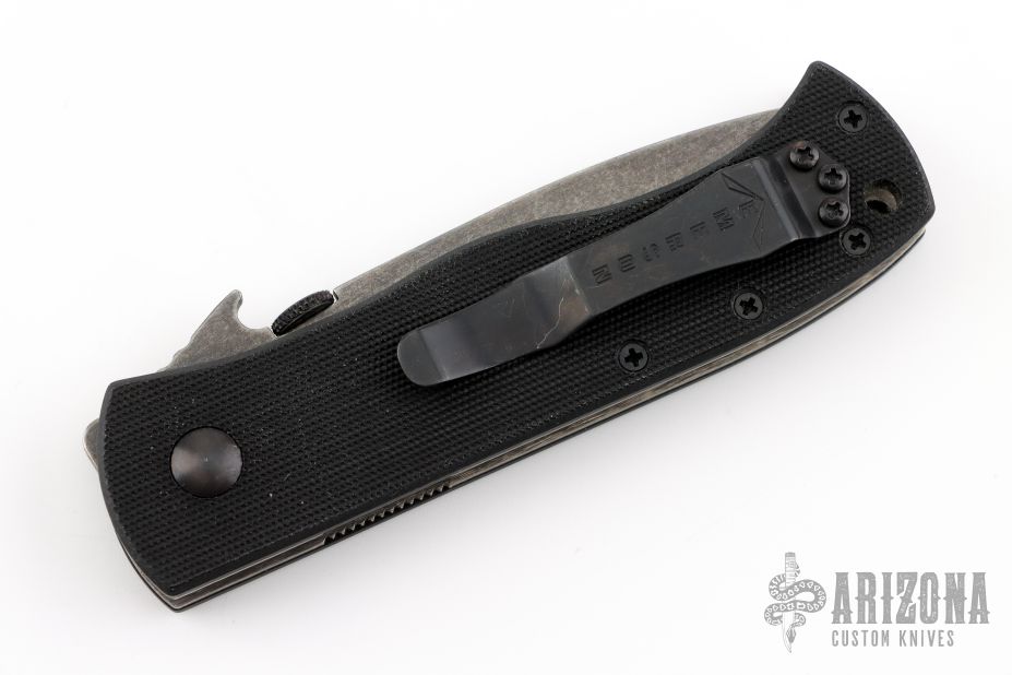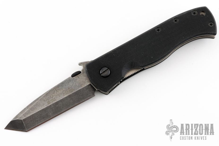 This CQC-7 by Emerson Knives has a tanto chisel ground blade with notched thumbrest, wave features and a single thumbstud. Has G-10 scales, titanium liners, barrel spacers, and a tip up black stainless clip. S/N 0251. Nice detent, lockup and blade seating. Includes the original box and papers.  Excellent Condition.